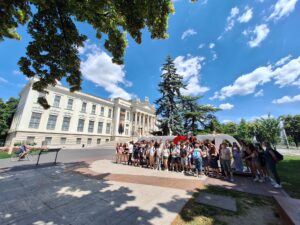 Az első találkozás helyszíne az iskolájuk udvara volt, ahol első körben az iskola igazgatónője köszöntötte iskolánk tanulóit, pedagógusait, majd ezután átadva a szót intézményvezető-helyettesünk mutatta be a mi iskolánkat, honnan érkeztünk. Rövid beszédet tartott városunkról és iskolánkról kiemelve a legfontosabb tevékenységeinket. Mint örökös ökoiskola és a fenntarthatóságra nevelés kiemelt képviselői azzal szerettük volna megköszönni vendéglátóink kedves fogadtatását, hogy barátságfát ajándékoztunk számukra. Az iskolájuk udvarán egy füves területen el is ültettük azt. A növény gondozását a továbbiakban szívesen vállalták. Ezzel a közös tevékenységgel pillanatok alatt elindult a kommunikáció és a közös játék a két iskola tanulói és a pedagógusok között is. A nyelv sem jelentett akadályt, voltak magyarul beszélő diákok is, akik szívesen fordítottak egymás között. A program végén egy közös fotót készítettünk ahol mindannyian együtt álltunk. Nagyon barátságosan fogadtak minket és ez a kötetlen beszélgetések során is érezhető volt.