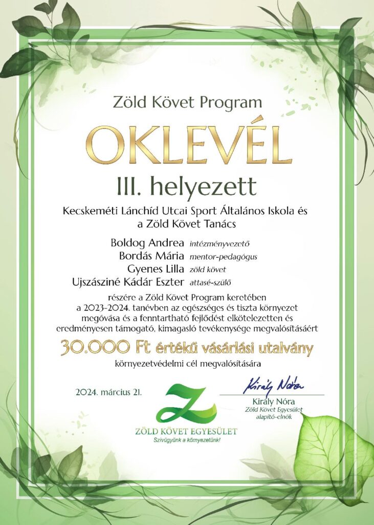 A Zöld Követ Egyesület alapító elnöke, Király Nóra és Raisz Anikó, az Energiaügyi Minisztérium államtitkára elismerésben részesítette a Zöld Követ Program legaktívabb tagintézményeit. Ahol a mi iskolánk is díjat nyert a kimagaslóan magas környezetvédelmi tevékenységünkért az országban számos iskola közül a megtisztelő III. helyezést értük el.